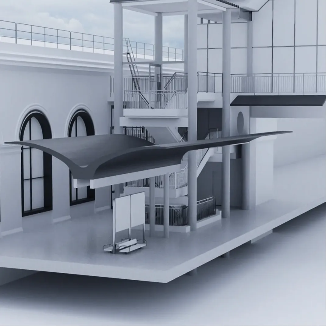 Geometric reproduction of the station building, staircases and structural elements from a cloud of points. The work is done to visualize, manage and further modernize the object.