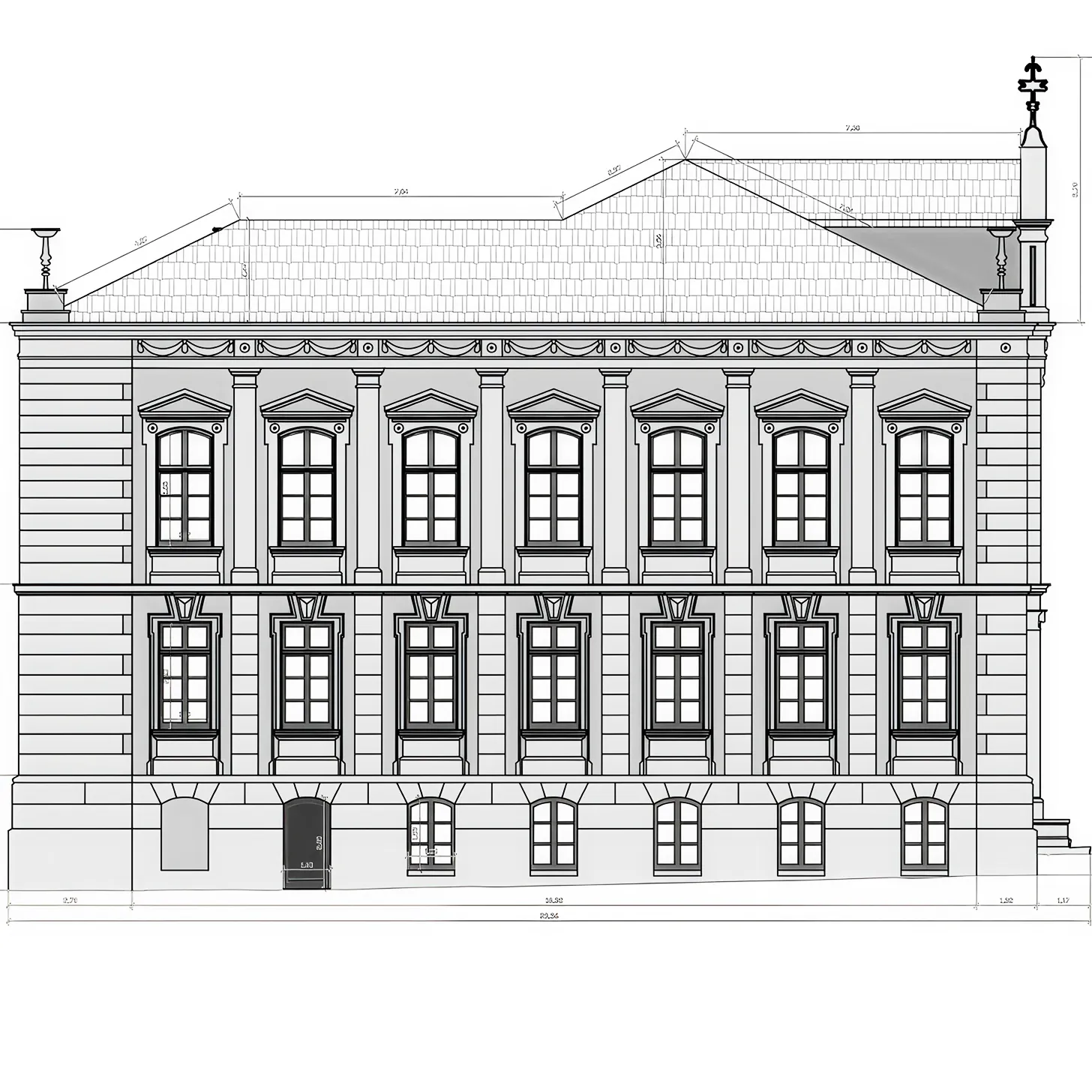 A set of 2D CAD drawings of facades and sections of a school building in Germany based on a point cloud has been developed. The project was executed to ensure accurate documentation of the object and preparation of data for further repair and modernization.